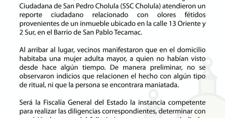 Sujeto que estaba con el cadáver de su madre no la tenía maniatada: San Pedro Cholula