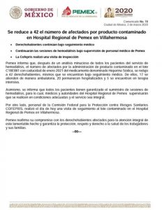 Tal como se comunicó el día de ayer, después de una revisión exhaustiva del proceso de hemodiálisis en el Hospital Regional de Pemex en Villahermosa por el reporte de reacciones adversas en pacientes que habían recibido hemodiálisis, se ordenó el retiro del lote del producto contaminado y se presentó la denuncia contra quien o quienes resulten responsables, para deslindar las responsabilidades que correspondan