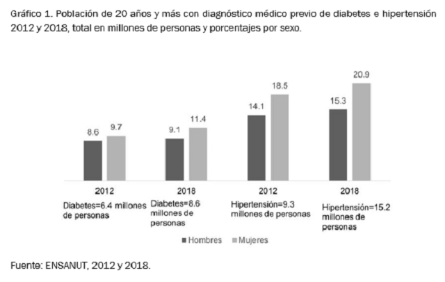 Un aspecto relevante que ayuda a entender los efectos del COVID-19 en México, son las condiciones precedentes de salud de la población. De acuerdo con la Encuesta Nacional de Salud (2018), el 10.3% de la población de 20 años o más contaba con un diagnóstico médico previo de diabetes; 75.2% de la población de 20 años o más tenían sobrepeso y obesidad; 18.4% de personas de 20 años o más contaba con un diagnóstico médico previo de hipertensión. En el siguiente gráfico es posible observar el comportamiento de ambas comorbilidades por sexo, a lo largo del tiempo. Como se puede distinguir, se han dado incrementos longitudinales, que desde ese tiempo mostraban la importancia del rediseño de políticas y programas de salud.