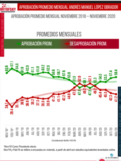 En noviembre del 2018, cuando estaba a punto de iniciar su gobierno, el presidente Andrés Manuel López Obrador tenía una aprobación ciudadana del 62.6 por ciento, de acuerdo a Consulta Mitofsky, de Roy Campos.