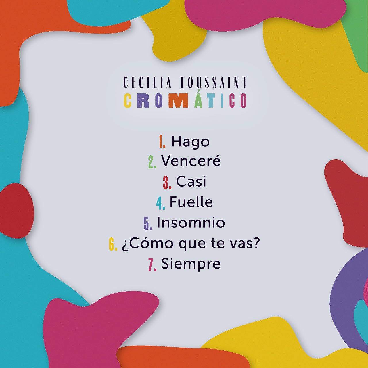 Los siete temas que conforman “Cromático” son “Hago” (letra y música: Cecilia Toussaint y Gabriel Bronfman), “Venceré” (letra: Arturo Arteaga / música: Santiago Solórzano Ruiz de Velasco), “Casi” (letra: Jorge Chacón y Cecilia Toussaint / música: Jorge Chacón, Julián André y Cecilia Toussaint), “Fuelle” (letra: Cecilia Toussaint / música: Jorge Chacón y Cecilia Toussaint), “Insomnio” (letra: Cecilia Toussaint / música: Julián André y Jorge Chacón), “¿Cómo que te vas?” (letra y música: José Manuel Aguilera) y “Siempre” (letra: Cecilia Toussaint / música: Fernando Toussaint).