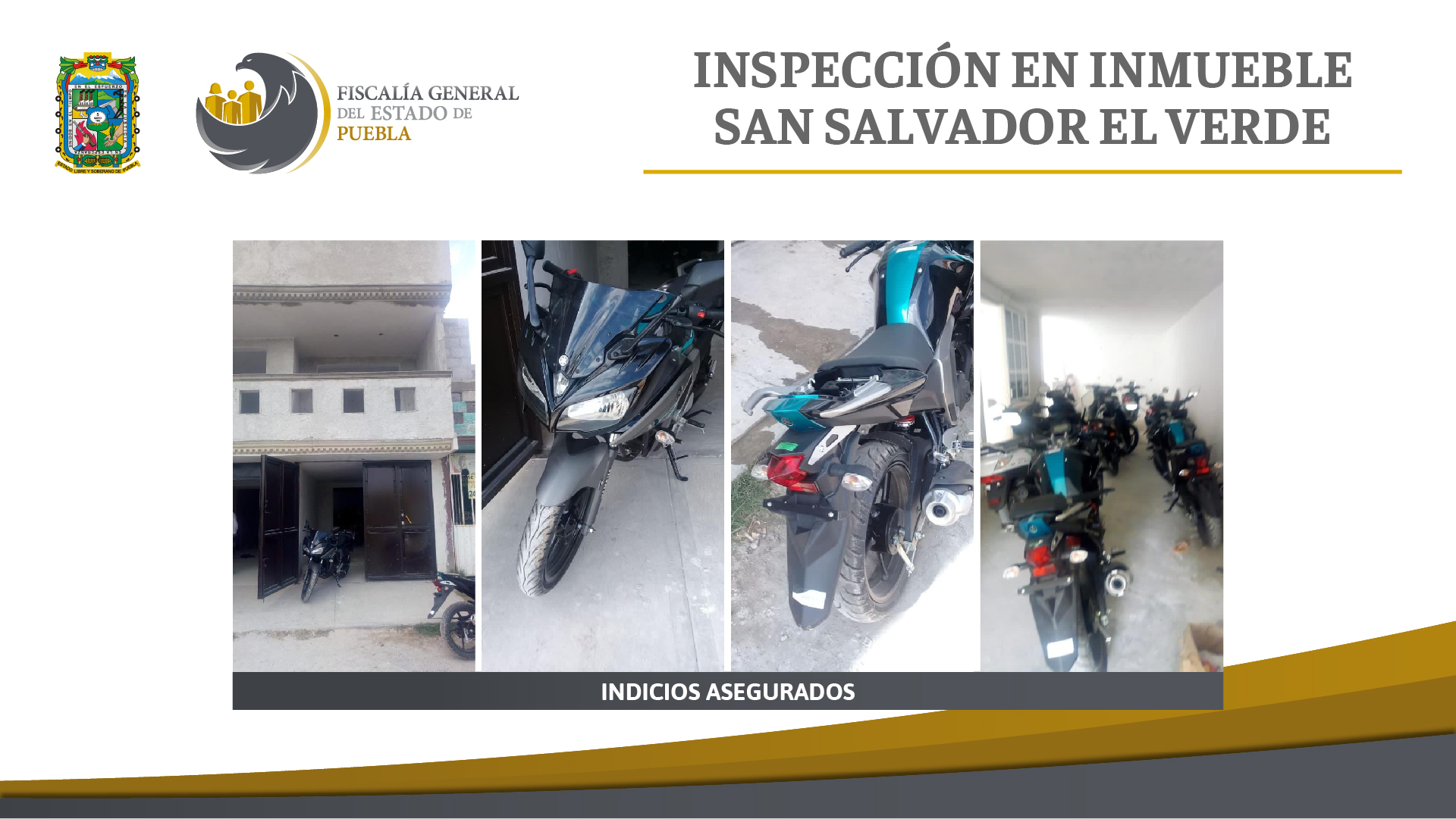 Derivado de la intervención de la Fiscalía General del Estado de Puebla, se logró el aseguramiento de 19 motos al parecer de procedencia ilícita y mercancía presuntamente robada en inmuebles de San Salvador El Verde.
