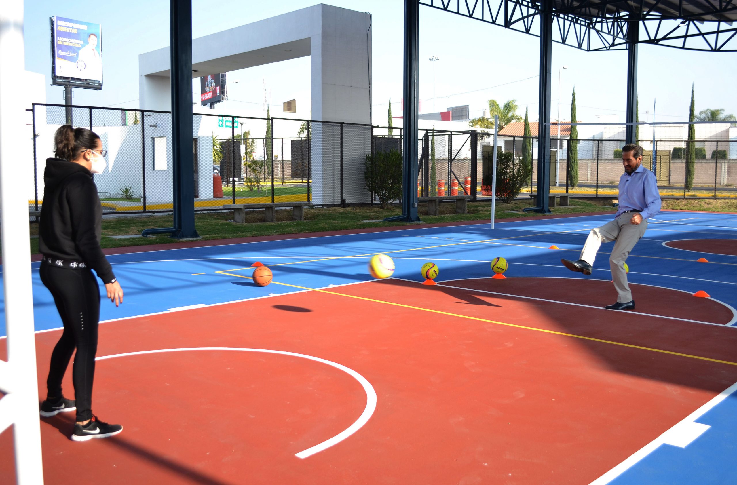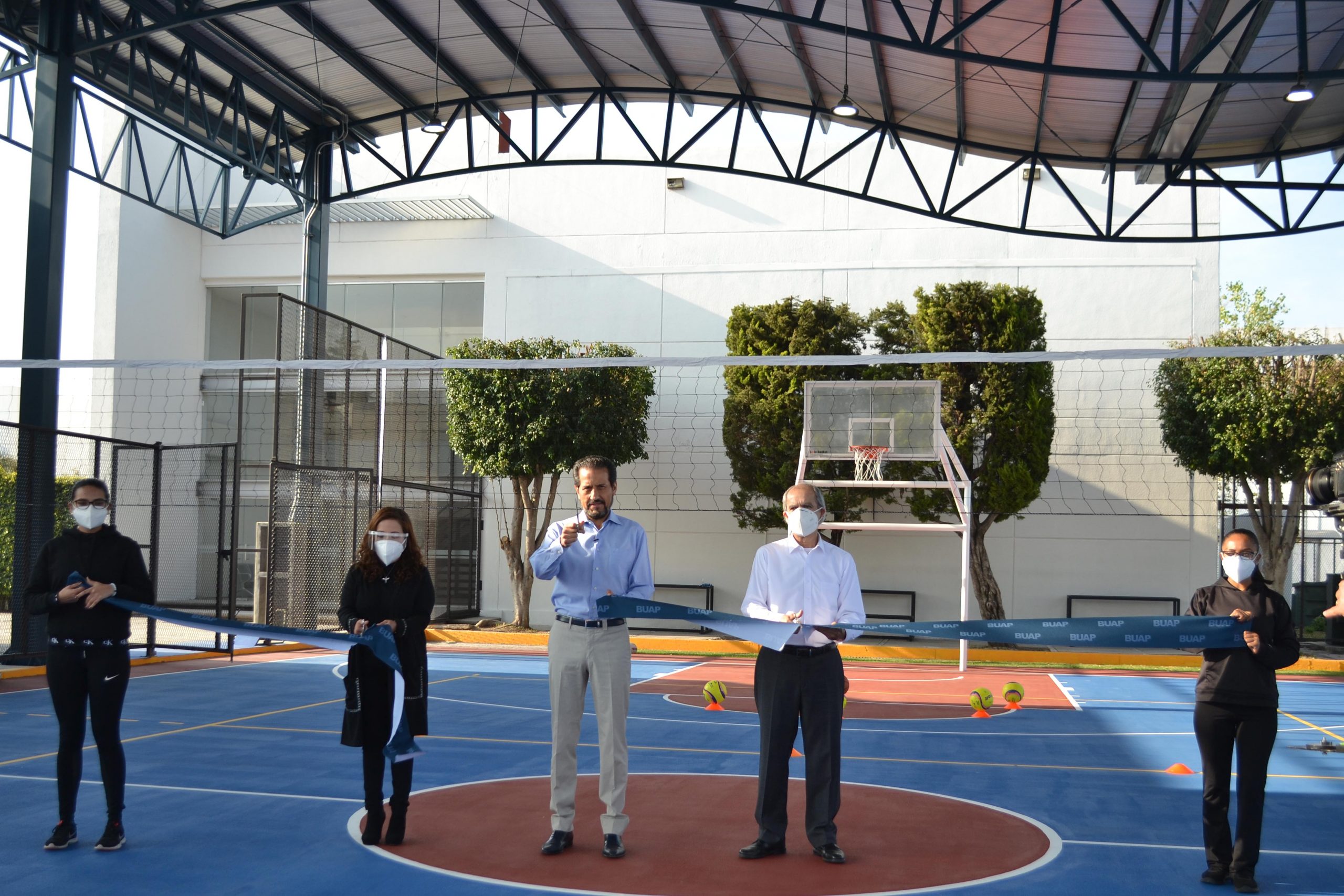 Acompañado de la directora de la Facultad de Ciencias de la Comunicación, Angélica Mendieta Ramírez, y del director de Infraestructura Educativa, Jorge Rodríguez y Morgado, el Rector Alfonso Esparza hizo el corte de listón y posteriormente realizó el primer tiro a la portería y el primer lanzamiento hacia la canasta de básquetbol.