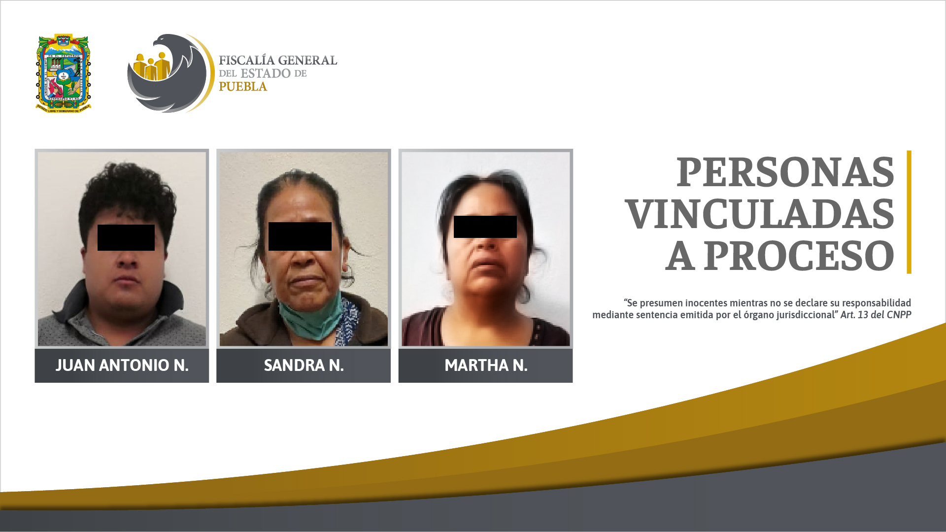 La Fiscalía General del Estado de Puebla logró obtener la vinculación a proceso de Sandra N. de 50 años, Martha N. de 50 años y Juan Antonio N. de 26 años de edad, investigados por su presunta responsabilidad en el delito de secuestro agravado.