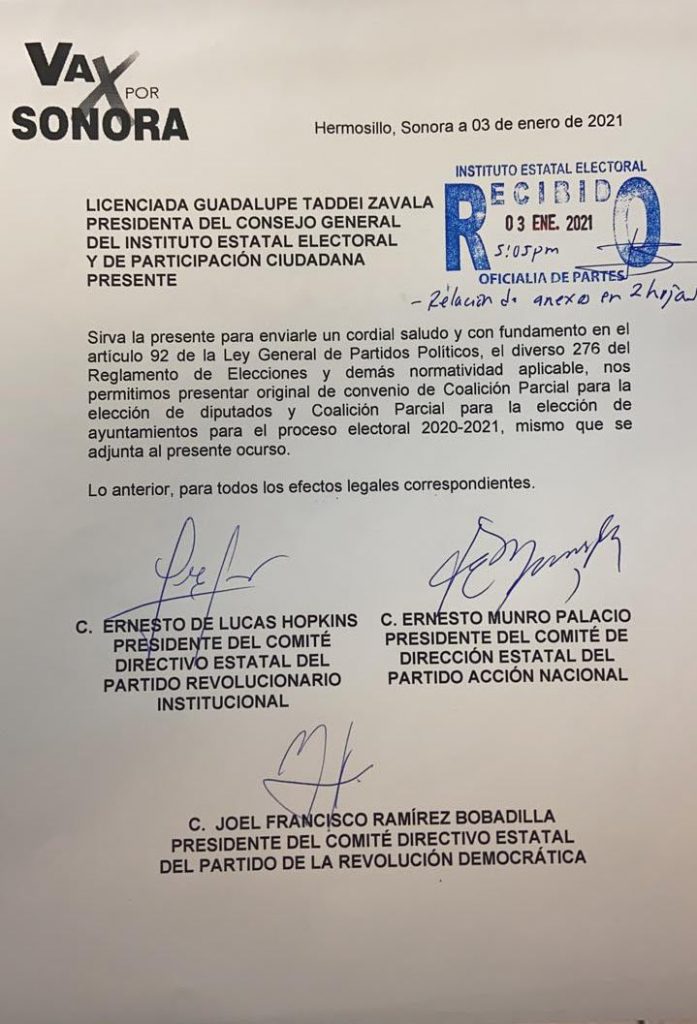 Registran PRI, PAN y PRD la alianza “Va por Sonora”