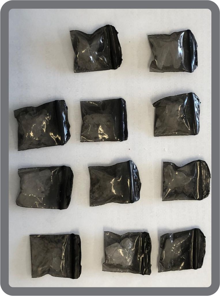 Por lo que, el personal de esta dirección procedió a inquirir a la persona, quien continuó actuando de manera evasiva hacia la autoridad, tras solicitarle realizar una inspección preventiva; se le localizó entre sus pertenencias once envoltorios con sustancia solida granulada características propias del cristal.