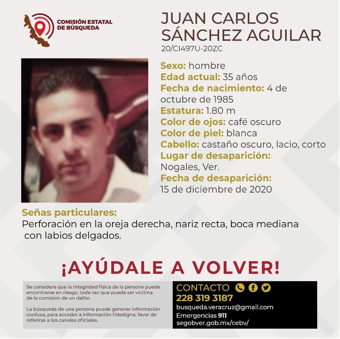 Solicitamos su valiosa colaboración para localizar a Juan Carlos Sánchez Aguilar, de 35 años. Fue visto por última vez el 15 de diciembre de 2020 en Nogales Veracruz.