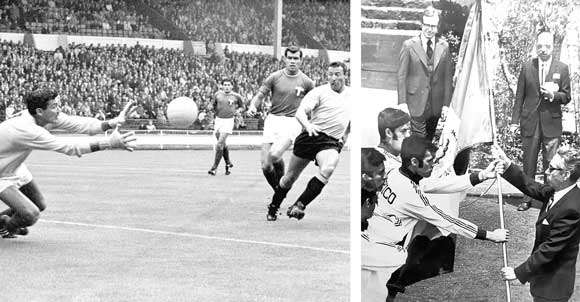 La Tota Carbajal y el Halcón Peña, entre el uruguayo Domingo Pérez, en Inglaterra 1966. Para México 1970, el presidente Gustavo Díaz Ordaz entregó la bandera mexicana al capitán nacional. Fotos: Archivo Excélsior, cortesía Gustavo Peña hijo. y AP