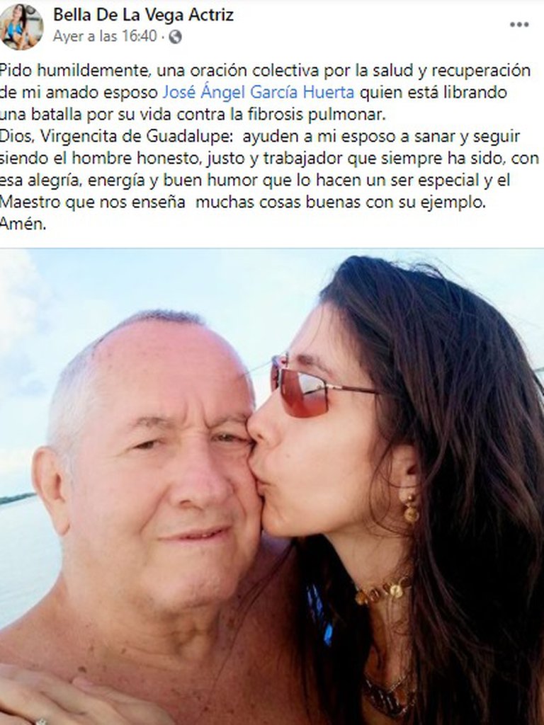 “Pido humildemente una oración colectiva por la salud y recuperación de mi amado esposo, José Ángel García Huerta, quien está librando una batalla por su vida contra la fibrosis pulmonar. Dios y Virgencita de Guadalupe: ayuden a mi esposo a sanar y seguir siendo el hombre honesto, justo y trabajador que siempre ha sido, con esa alegría, energía y buen humor que lo hacen un ser especial”.