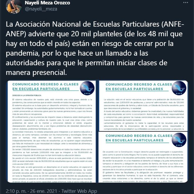 Ante este panorama, Alfredo Villar, presidente de la ANFE-ANEP, demandó este martes a la Secretaría de Educación Pública (SEP) abrir un diálogo y que se fije una cita para que las escuelas privadas puedan reanudar actividades para finalizar el ciclo escolar 2020-2021 en las aulas, siguiendo los protocolos de higiene que eviten la propagación del SARS-CoV-2 y la quiebra de más planteles.