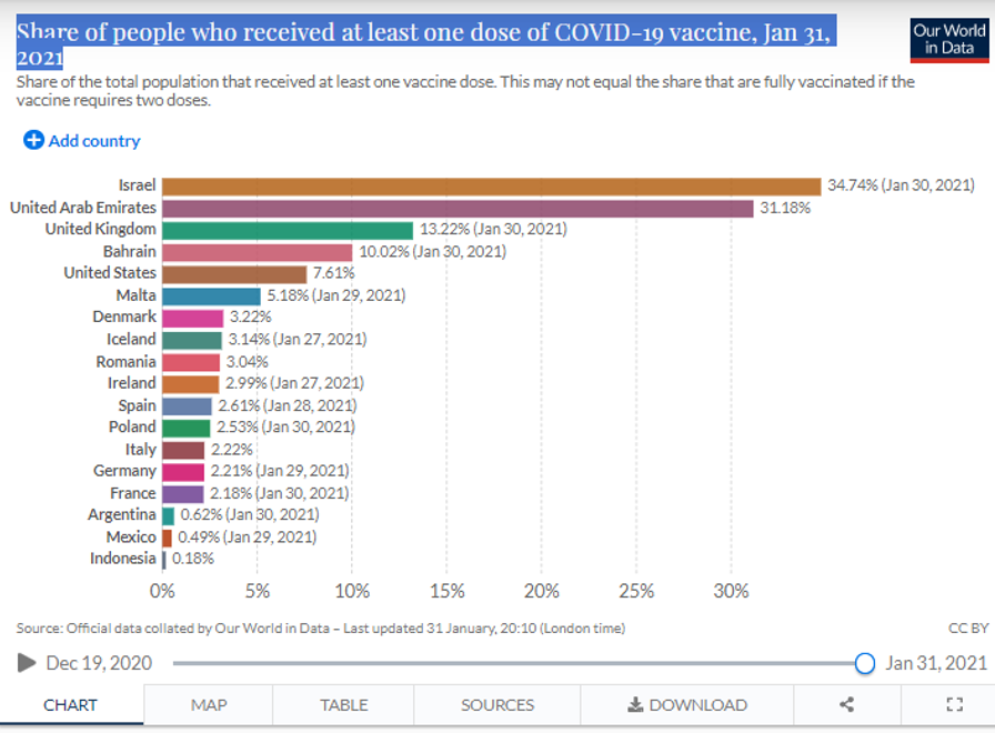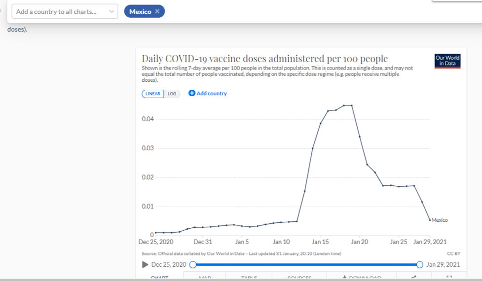 El siguiente cuadro muestra la cantidad diaria de dosis de vacuna COVID-19 administradas por cada 100 personas. Esto se muestra como el promedio móvil de siete días. Tenga en cuenta que esto se cuenta como una dosis única y puede que no sea igual al número total de personas vacunadas, dependiendo del régimen de dosis específico .