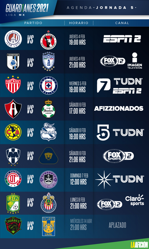 Para el viernes 5, destaca el Necaxa vs Cruz Azul en el Victoria, siguiendo con la acción del sábado 6 de febrero, en donde resalta los duelos América-Puebla, en el Estad Azteca, y el Monterrey vs Pumas, en el Gigante de Acero.