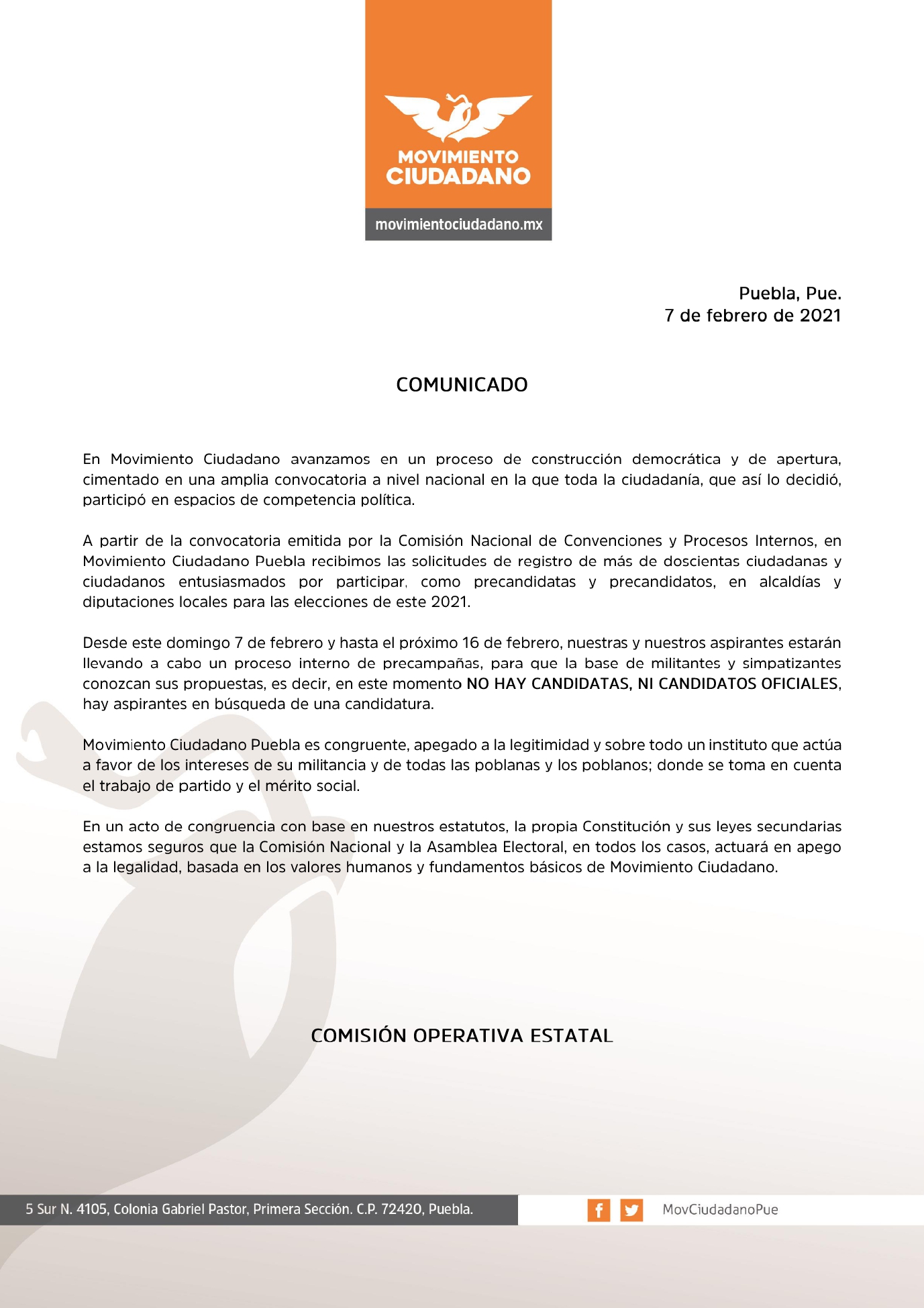 Política Movimiento Ciudadano aclara que todavía no tiene candidatos oficiales By Redaccion1 / 8 febrero, 2021 Staff/Rossi You may also like Germán Reyna y Herrero rinde protesta como titular de la ASE By Redaccion1 / 15 enero, 2026 Morena fija posición ante abandono del PAN en la sesión legislativa By Redaccion1 / 15 enero, 2026 152 intentos de linchamiento el año pasado en Puebla: Aguilar Pala By Redaccion1 / 15 enero, 2026 Designan a Germán Reyna y Herrero al frente de la ASE By Redaccion1 / 15 enero, 2026 Inician mañana comparecencias del gabinete By Redaccion1 / 14 enero, 2026 Navegación de entradas Se confirma la alianza “Juntos Haremos Historia en Puebla” conformada por MORENA y PT; oficializan acuerdo ante autoridades electoralesDomingo de súper tazón y muerte: Ayer fallecieron 414 personas más por Coronavirus en México Deja un comentario Cancelar respuestaTu dirección de correo electrónico no será publicada. Los campos obligatorios están marcados con *Comentario * Nombre * Correo electrónico * Web Δ