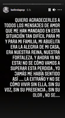 Hasta el momento Belinda no se ha pronunciado al respecto de la muerte de la abuela de su novio, sin embargo, agradeció a todos sus fanáticos por las muestras de apoyo tras su pérdida