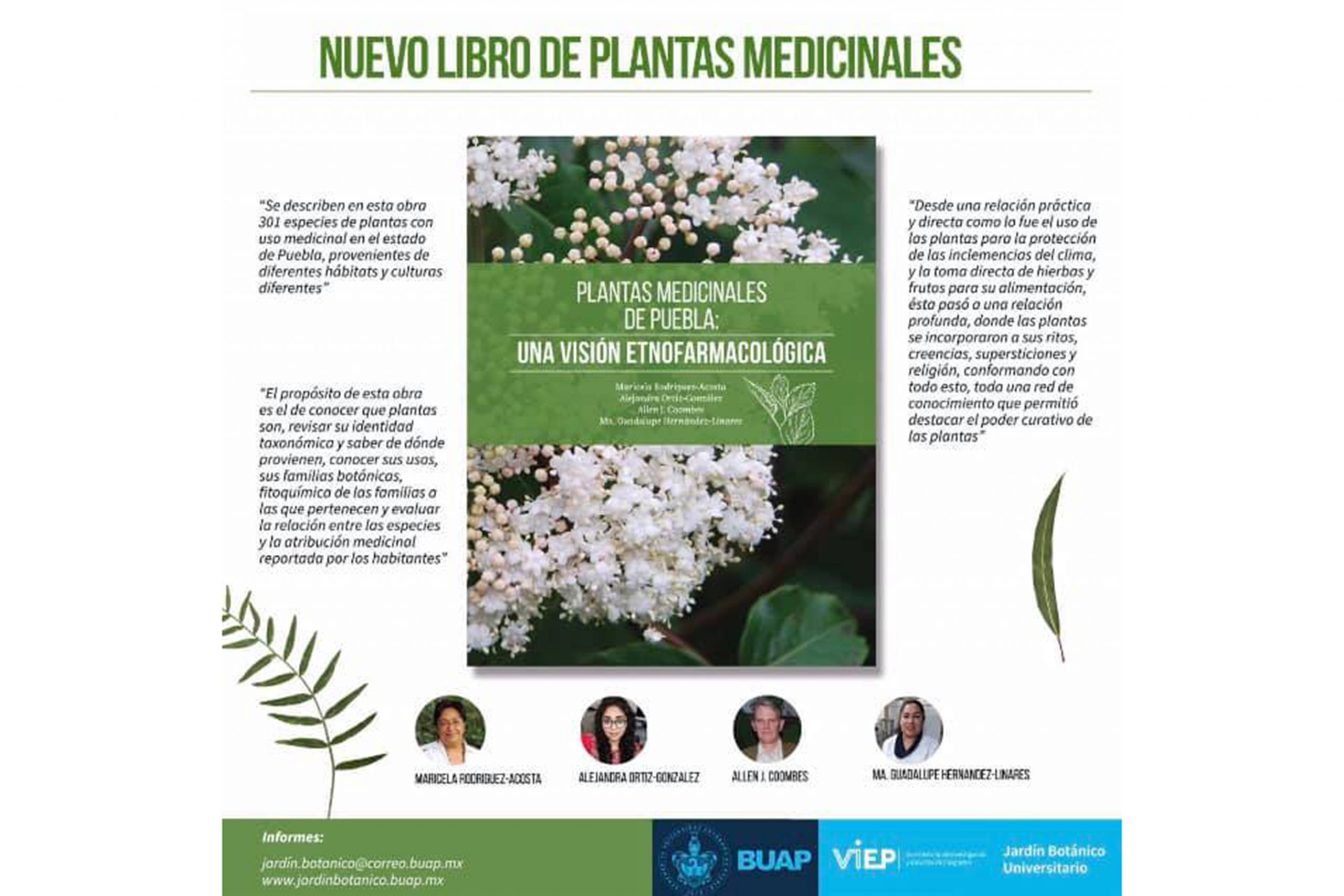 El libro Plantas medicinales de Puebla: una visión etnofarmacológica tiene un costo de 399 pesos y puede ser adquirido en la librería Profética, para mayor información escribir a jardin.botanico@correo.buap.mx o ingresar a www.jardinbotanico.buap.mx