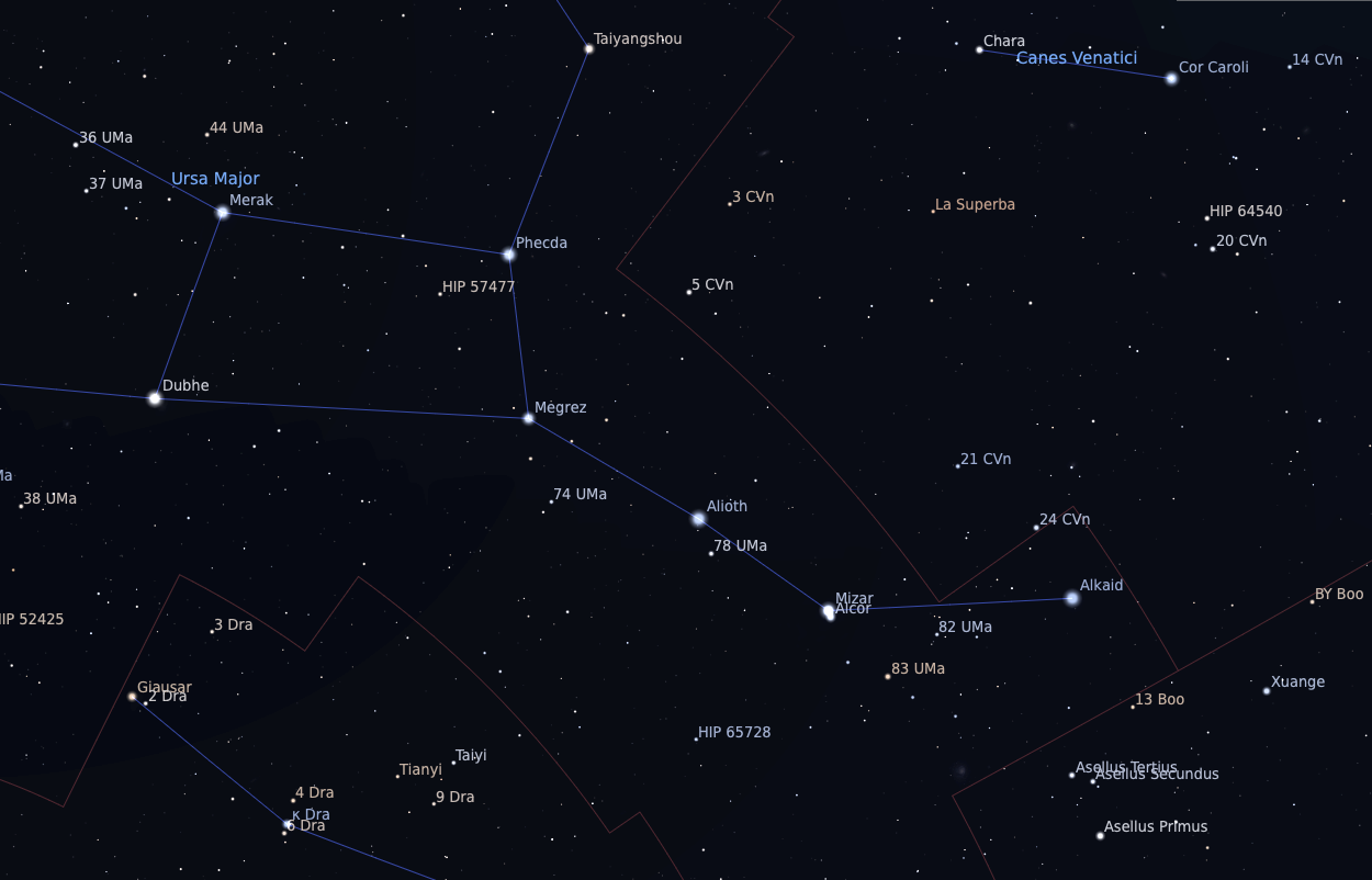 Comenzamos el mes con una estrella doble, Mizar y Alcor, localizadas en la “cola” de la Osa Mayor. Estas dos estrellas de magnitud 2.2 y 3.9, respectivamente, están separadas 11´ 48¨ en el cielo. Distinguirlas como dos estrellas individuales, a simple vista, es una muestra de agudeza visual. No está claro si forman un sistema binario o es una estrella doble por proyección en el cielo. Cada una de ellas, a su vez, es también un sistema binario. Mizar fue la primera estrella binaria descubierta con el telescopio en 1617. Es uno de los objetos más fáciles de observar con telescopios pequeños o binoculares (ver figura).