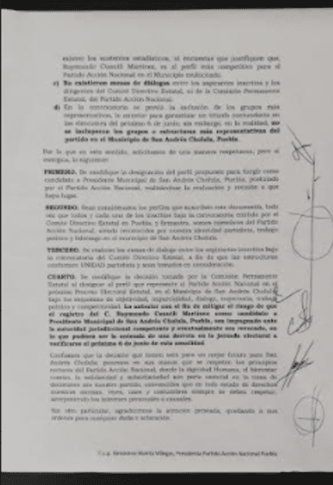 Piden que se modifique la decisión tomada por la Comisión permanente estatal al designar el perfil que representa el Partido Acción Nacional en San Andrés Cholula bajo los esquemas de objetividad, imparcialidad, trayectoria, trabajo político y competitividad. Con el fin de mitigar el riesgo que el registro de Raymundo Cuautli Martínez de que sea impugnado ante la autoridad jurisdiccional competente y eventualmente sea revocado, en lo que pudiera ser la antesala de una derrota en la jornada electoral del próximo 6 de junio.