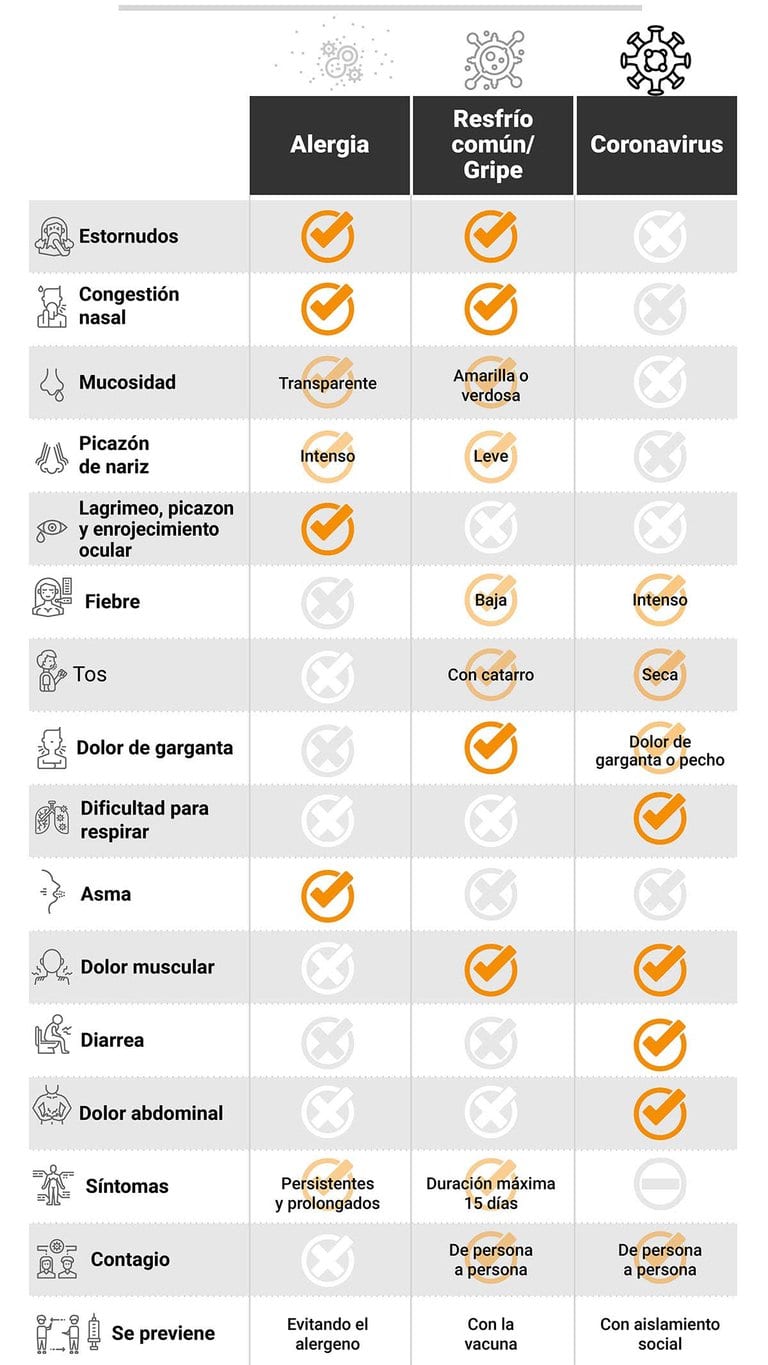“Los cuadros de alergias son reconocidos por las personas que las padecen: rinitis, conjuntivitis, estornudos. En cambio, el COVID-19 tiene una presentación más proteiforme y esto no pasa desapercibido. Además, al estar inmerso en una pandemia, se agudizan los sentidos para evaluar si lo que sucede tiene algo que ver con el virus que nos asola”, compartió a Infobae el infectólogo Hugo Pizzi.