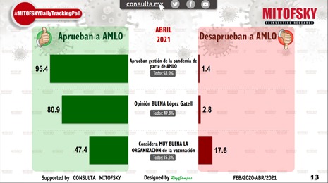 El 58.0% de encuestados aprueba el manejo de la pandemia que realiza el presidente, aunque presenta una pequeña pérdida respecto a la semana pasada. La opinión positiva de la imagen del Dr. Hugo López Gatell está en 49.8% al 11 de abril.