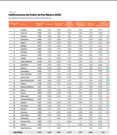 En contraste, ese mismo Índice de Paz del IEP pone a Baja California, Colima, Quintana Roo, Chihuahua y Guanajuato como los 5 peores estados del país en la materia…a pesar de que los habitantes de varias de estas entidades NO se sientan especialmente intranquilos en los rubros de violencia e incidencia delictiva: Índice de paz México 2020