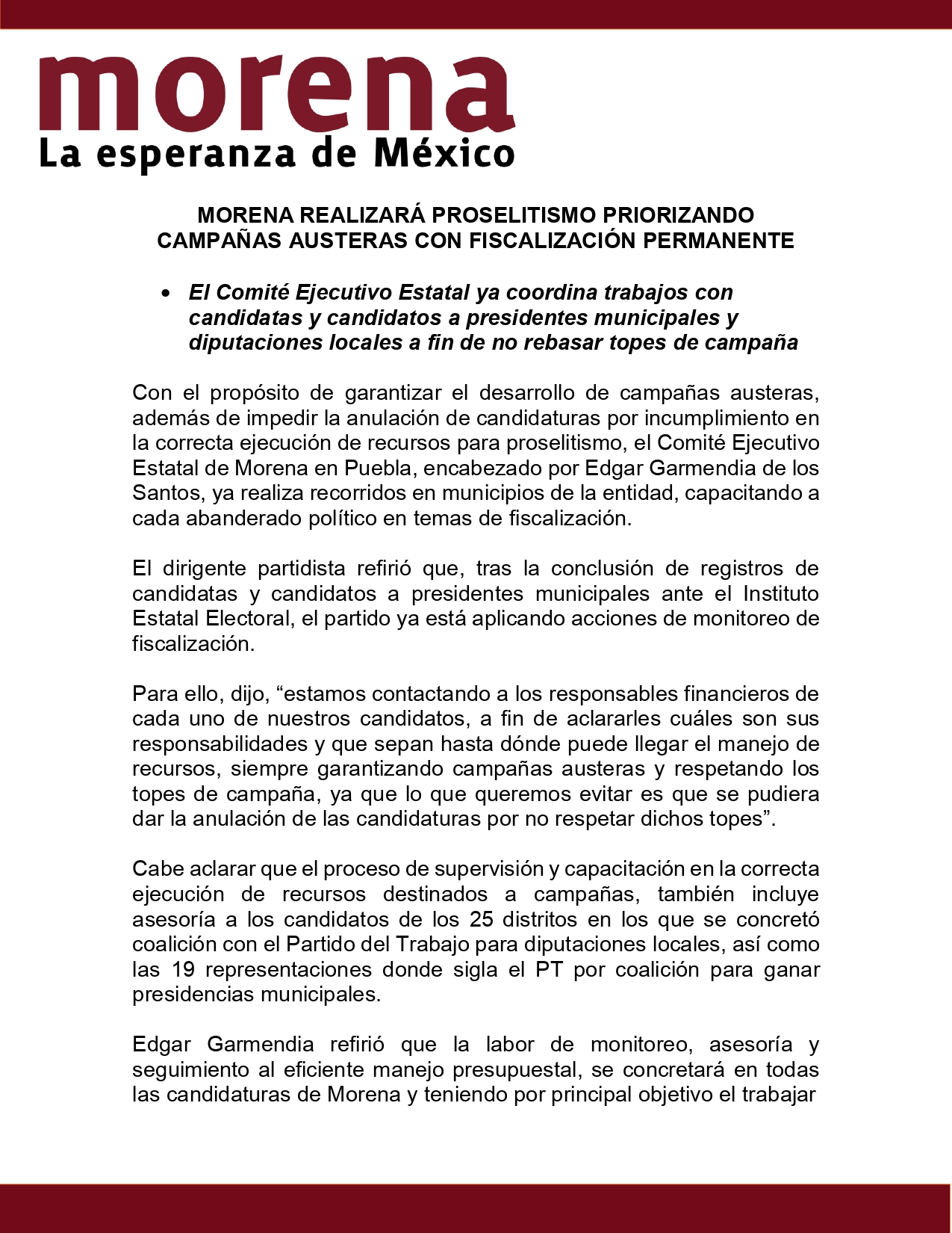 Morena realizará proselitismo priorizando campañas austeras con fiscalización permanente
