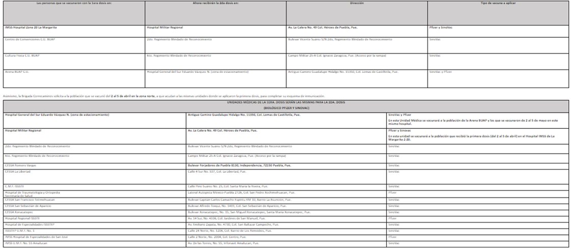 Aquellas personas que acudieron del 29 de marzo al 1 de abril a vacunarse en Ciudad Universitaria (CU-BUAP) y en los otros puntos que se designaron para tal fin, serán atendidas en las siguientes unidades médicas: