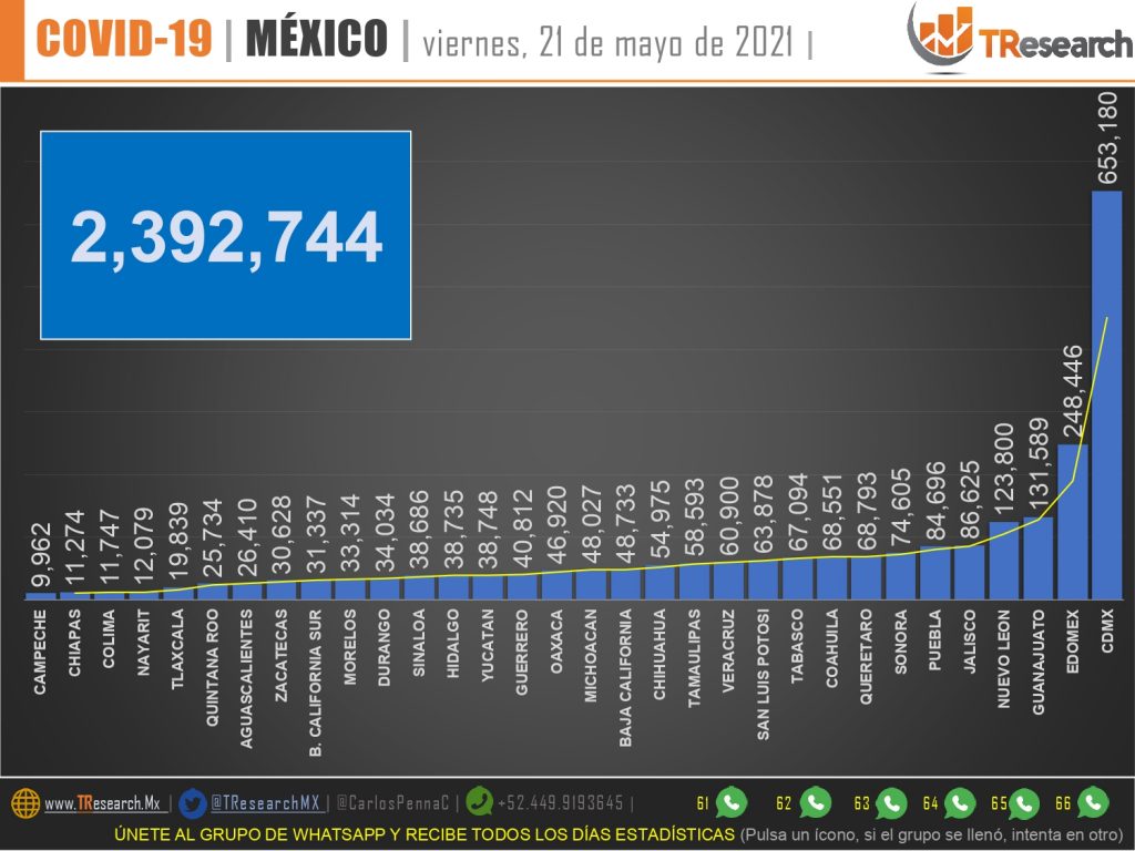 Por Roy Campos #MEXICO CASOS: 2,392,744 HOY: 2,604 MUERTES: 221,256 HOY: 176 *TOP CONTAGIOS TOTAL*
