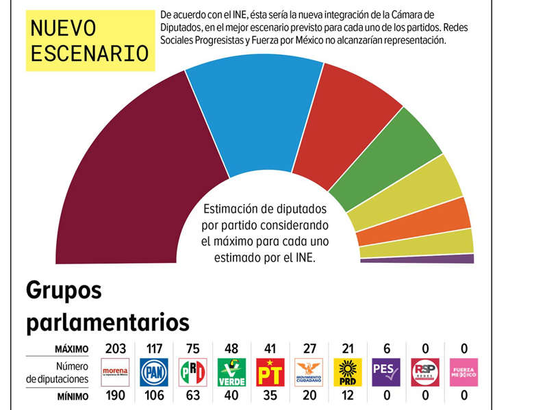 Morena logró entre 190 y 203 curules; el Partido Verde, entre 40 y 48; el Partido del Trabajo, entre 35 y 41 diputaciones, y el PES, entre cero y seis lugares.