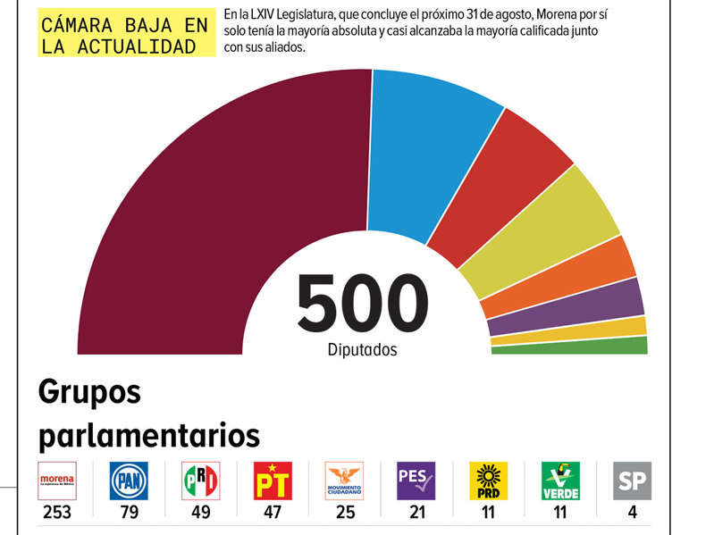 Actualmente, Morena tiene 253 integrantes, por lo que el escenario máximo de 203 legisladores implica que perdió 50 integrantes y, con ello, la mayoría absoluta que tenía por sí mismo.