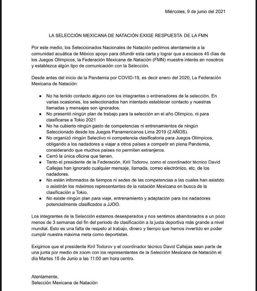 “Desde enero de 2020, la Federación Mexicana de Natación no ha tenido contacto alguno con los integrantes o entrenadores de la selección. En varias ocasiones, los seleccionados han intentado establecer contacto y nuestras llamadas y mensajes son ignorados. No presentó ningún plan de trabajo para la selección en el año olímpico, ni para clasificarse a Tokio 2021. No ha cubierto ningún gasto de competencias, ni entrenamientos de ningún seleccionado desde los Juegos Panamericanos Lima 2019.