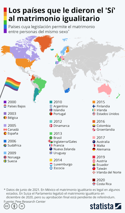 En América Central, Costa Rica es el único país que hace poco legalizó la unión entre personas del mismo sexo. Mientras que Suiza, el Parlamento legalizó el matrimonio igualitario en diciembre de 2020, pero su aprobación final se someterá a un referéndum.