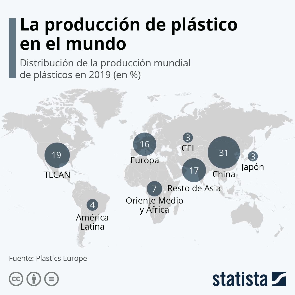 Los datos de la asociación Plastics Europe, en 2019 la producción de plásticos a nivel mundial alcanzó los 368 millones de toneladas, nueve toneladas más que en el año anterior. En Asia se produjeron 51% de los plásticos del mundo. China, que en 2019 fue el país que más residuos plásticos de un solo uso generó, fue responsable del 31% de la producción mundial de plásticos, fabricando 82 kg per cápita, mientras que Japón, con solo el 3% de la producción mundial, logró producir 88 kg. En los países del TLCAN (actual T-MEC), es decir, Canadá, Estados Unidos y México, solo se produjo el 19% del plástico mundial en total. Sin embargo, esto equivale a 141 kg per cápita, la cifra más alta por persona.