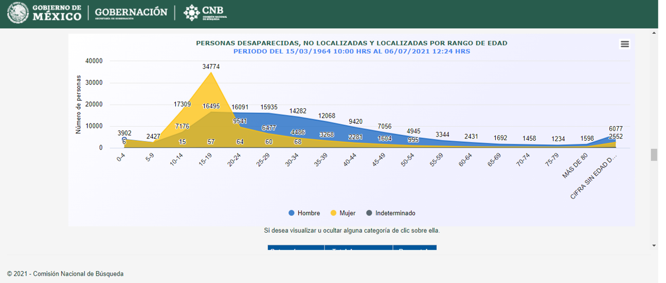 De acuerdo a la CNB, del total de personas no encontradas 66 mil 955 era (o es) hombre, 22 mil 134 mujer y de 514 no se logró determinar el sexo. Y de la gente sí localizada, pero sin vida, 7 mil 373 pertenecía al género masculino, mil 272 al femenino y de 11 no se pudo definir su naturaleza. Otro dato interesante es que de la gente que sí pudo encontrarse la mayoría (68 mil 867) es fémina y 53 mil 304 varón, aunque hay 89 indeterminados.