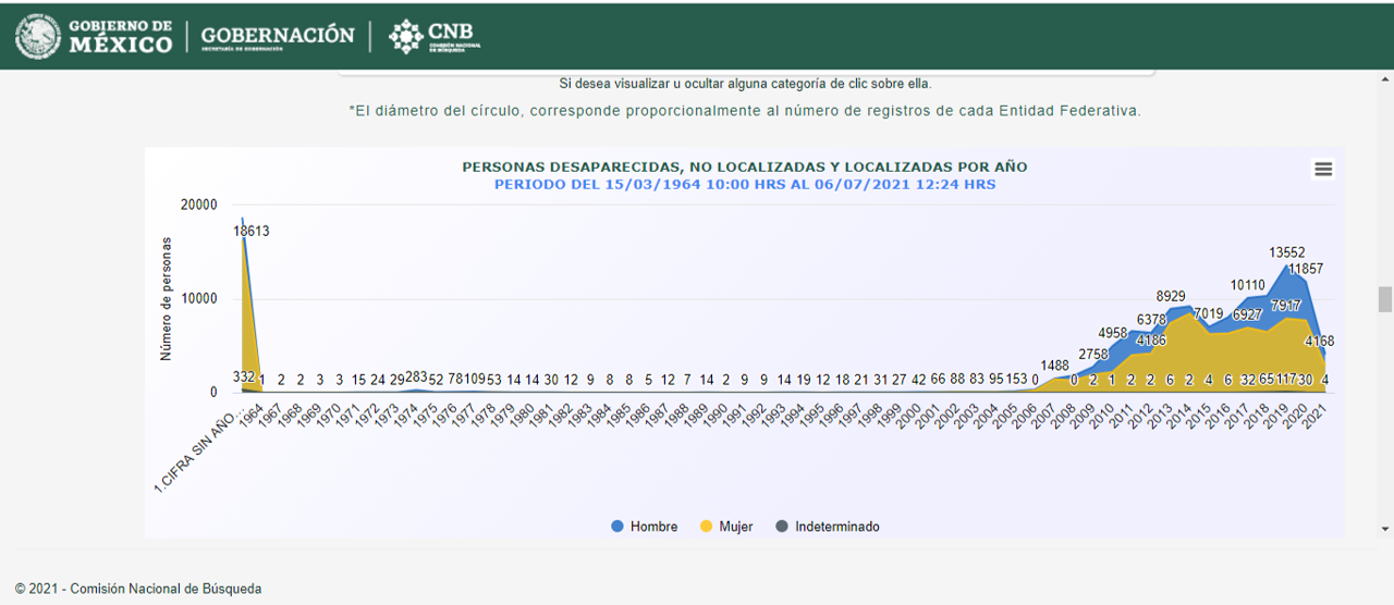 La CNB detalló que los años en que más desapariciones se reportaron fueron 2013, 2014, 2019, 2020. Respecto a Puebla, de 1964 a la fecha se han formulado 9 mil 247 reportes de gente no encontrada entre personas si/no localizadas y llama la atención el predominio femenino (4966 casos), por 4276 hombres y 5 indeterminados