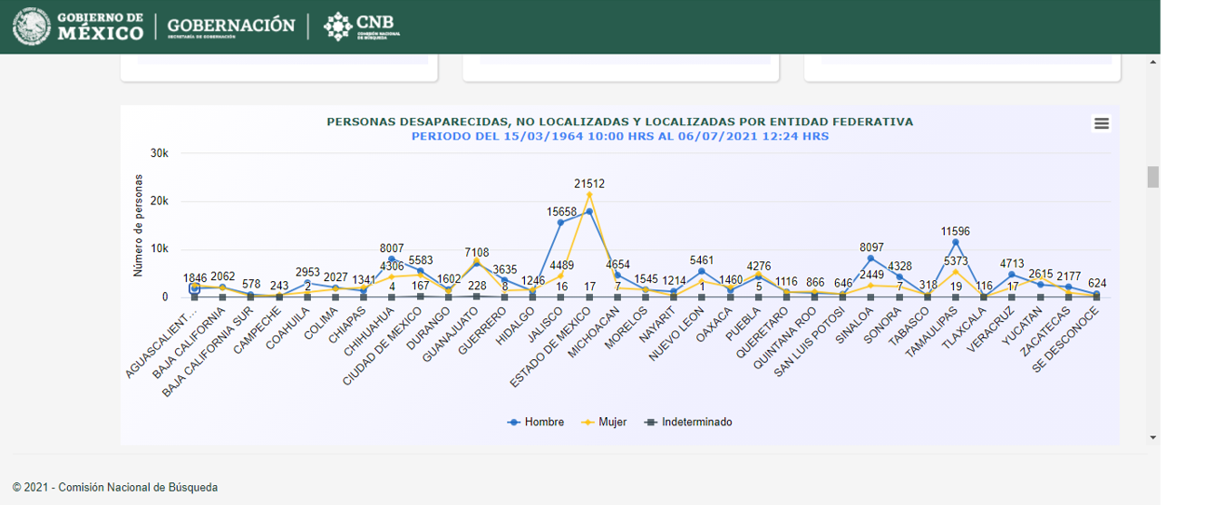 Entre el 3 de marzo de 1964 y el 6 de julio de 2021 (ayer) en México fueron reportadas desaparecidas 220 mil 518 personas, de las cuales se localizó al 59.37 por ciento, pero casi 90 mil nunca se hallaron y las principales entidades donde la gente se “pierde” y no aparece son Jalisco, Tamaulipas, Estado de México, Veracruz y Nuevo León, de acuerdo a la Comisión Nacional de Búsqueda (CNB), que elaboró el Registro Nacional de Personas Desaparecidas (RNPDNO).