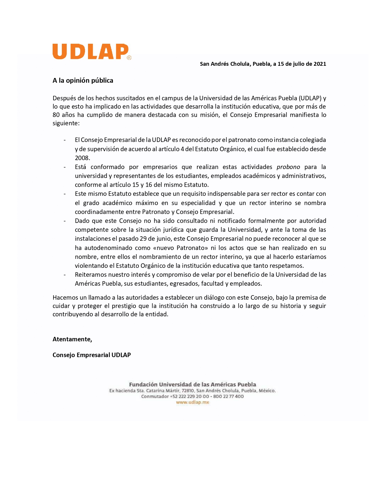 En la UDLAP sigue la guerra de patronatos y rectores; Consejo de Empresarios desconoce a Ríos Piter