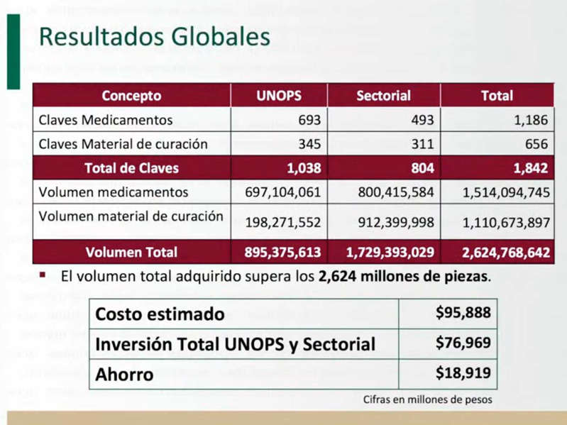 De esta manera se adquirieron mil 186 claves de medicamentos y 656 claves de material de curación, lo que representó un ahorro de 76 mil 969 millones de pesos y un ahorro de 18 mil 919 millones de pesos.