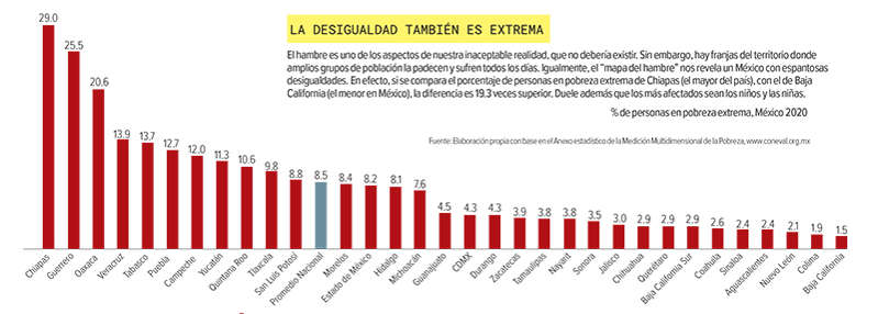 Hay 11 entidades que tienen un porcentaje superior al señalado: Chiapas, con 29% de sus habitantes en pobreza extrema; en Guerrero hay 25.5%; en Oaxaca, 20.6; Veracruz tiene 13.9%; Tabasco, 13.7%; Puebla, 12.7%; Campeche, 12%; Yucatán, 11.3%; Quintana Roo, 10.6%; Tlaxcala, 9.8%, y San Luis Potosí, 8.8 por ciento.