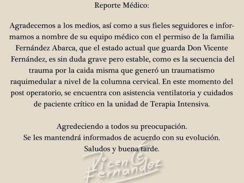 En el texto se agradece a los medios y a los fieles seguidores la preocupación por el cantante; además, se solicita la compresión para que la prensa deje libre el acceso al hospital a todo integrante de la familia Fernández Abarca con motivo de “la sana distancia y no poner en riesgo la salud de Don Vicente Fernández en estos momentos críticos por los que está atravesando”.