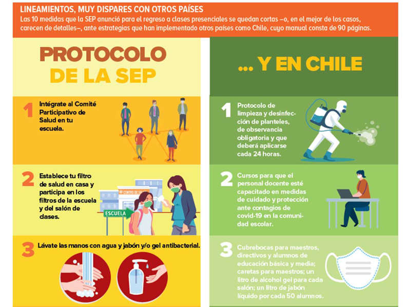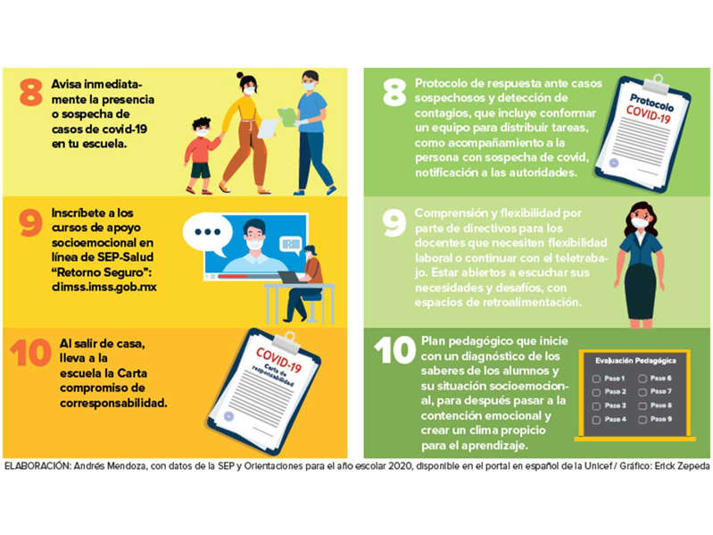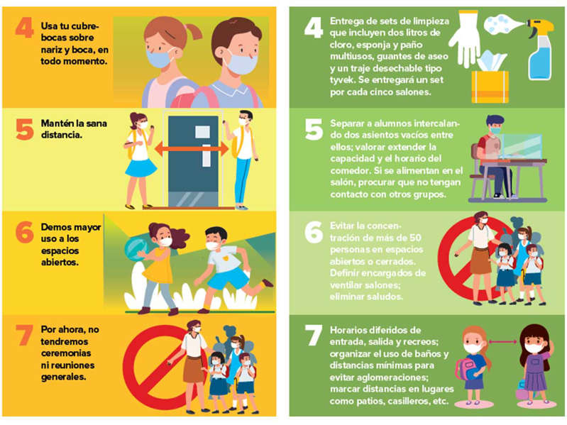 En conferencia en Palacio Nacional, anunció diez medidas que a partir del 30 de agosto deberán seguir las comunidades escolares, como establecer filtros sanitarios en casa, la entrada a la escuela y el salón, uso de cubrebocas y aprovechar espacios abiertos. Los papás deberán firmar una carta compromiso de corresponsabilidad si deciden enviar a sus hijos a la escuela.