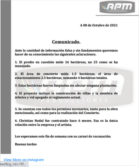 AMP producciones reiteraba entonces la invitación al concierto y argumentaba que los señalamientos sobre remoción y desmonte de vegetación eran falsos y sin fundamentos, debido a que las “hectáreas fueron limpiadas sin afectar ninguna plantación”.