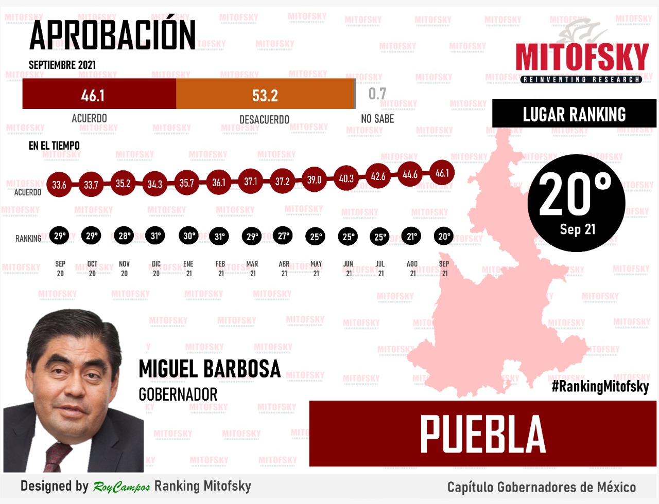 En septiembre del año pasado, el gobernador Miguel Barbosa Huerta era aprobado por el 33.6 por ciento de los poblanos y, 12 meses más tarde, ese indicativo subió al 46.1%, de acuerdo al más reciente estudio demoscópico de Consulta Mitofsky, la empresa de Roy Campos.