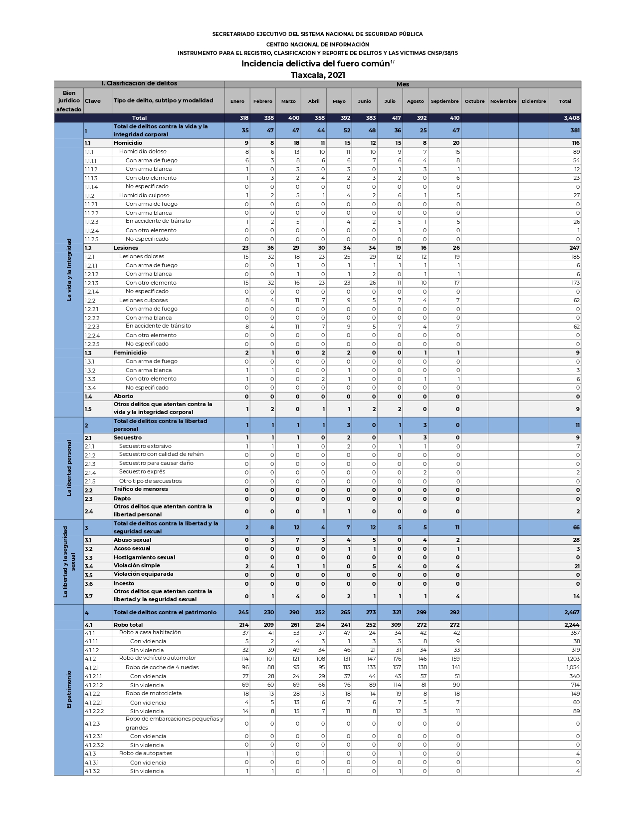 En septiembre del año pasado en Tlaxcala se denunciaron tres feminicidios, mientras que ese mes, pero en el 2021 hubo uno, de acuerdo a datos del Sistema Nacional de Seguridad Pública (SNSP). También bajó el secuestro, ya que en el noveno mes del 2020 se colocaron dos denuncias por esa felonía, en tanto que este año y ese mes no se registró ningún incidente de ese tipo.