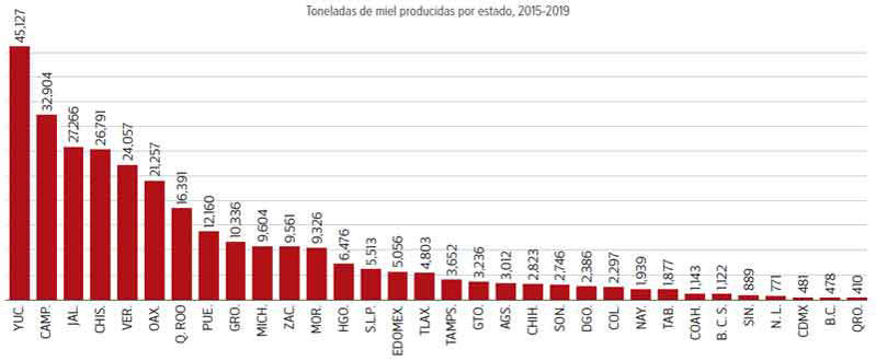 De acuerdo con los datos oficiales, los estados que mayor número de toneladas de miel produjeron de 2015 a 2019 (últimos años para los que se tienen datos) son Yucatán, con un acumulado en el periodo, de 45 mil 127 toneladas; Campeche, con 32 mil 904; Jalisco, con 27 mil 266; Chiapas, 26 mil 791; Veracruz, 24 mil 57; Oaxaca, 21 mil 527; Quintana Roo, 16 mil 391; Puebla, 12 mil 160; Guerrero, 10 mil 366, y Michoacán, nueve mil 604 toneladas de miel en los cinco años considerados.