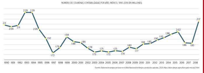 Históricamente, el registro del Atlas que se comenta estima que en el año de 1961 había en México 1.98 millones de colmenas, llegando a una cifra récord en 1983, con 2.69 millones, año a partir del cual inició un declive en su producción y mantenimiento, con recuperaciones relevantes en los años 2015, con 2.017 millones de colmenas y en 2018, cuando se llegó a la cifra más alta en 23 años, al alcanzar la cifra de 2.17 millones de colmenas.