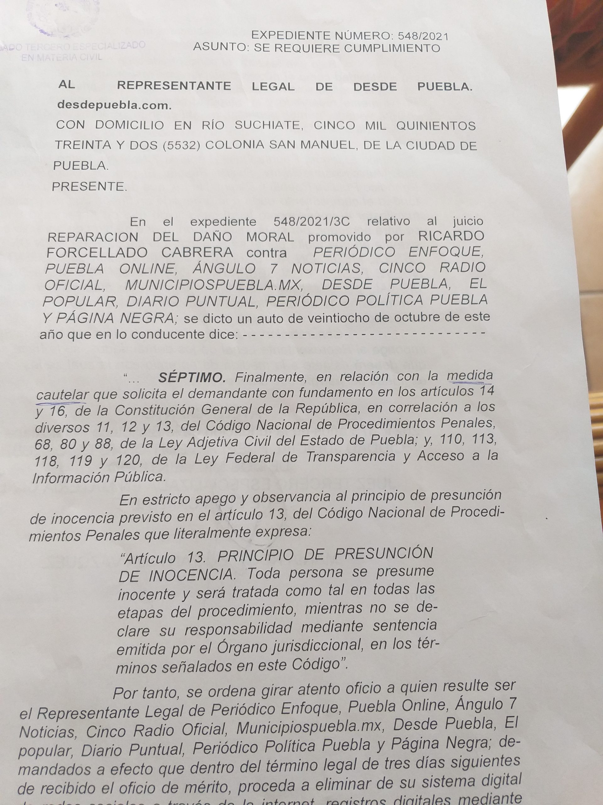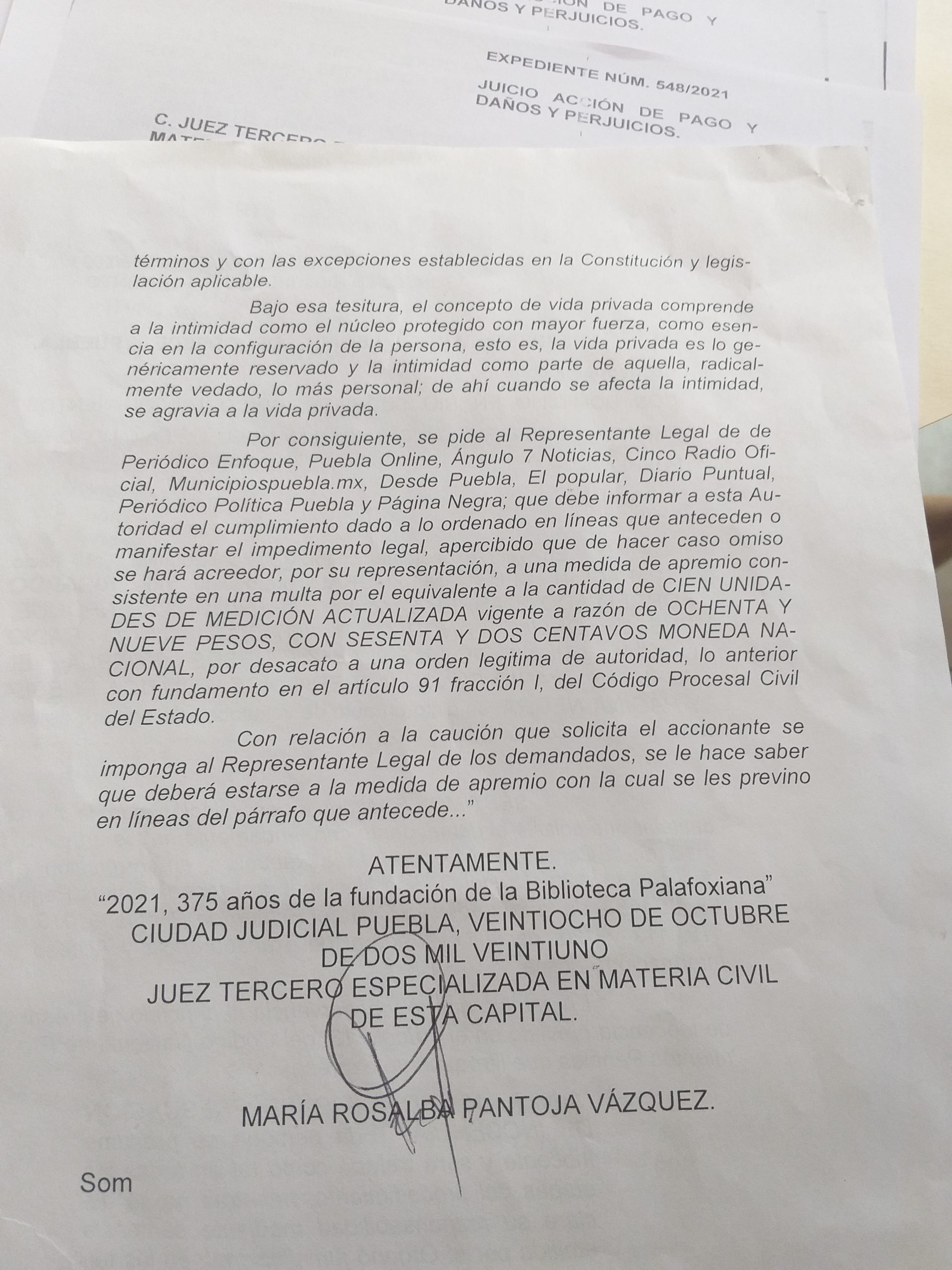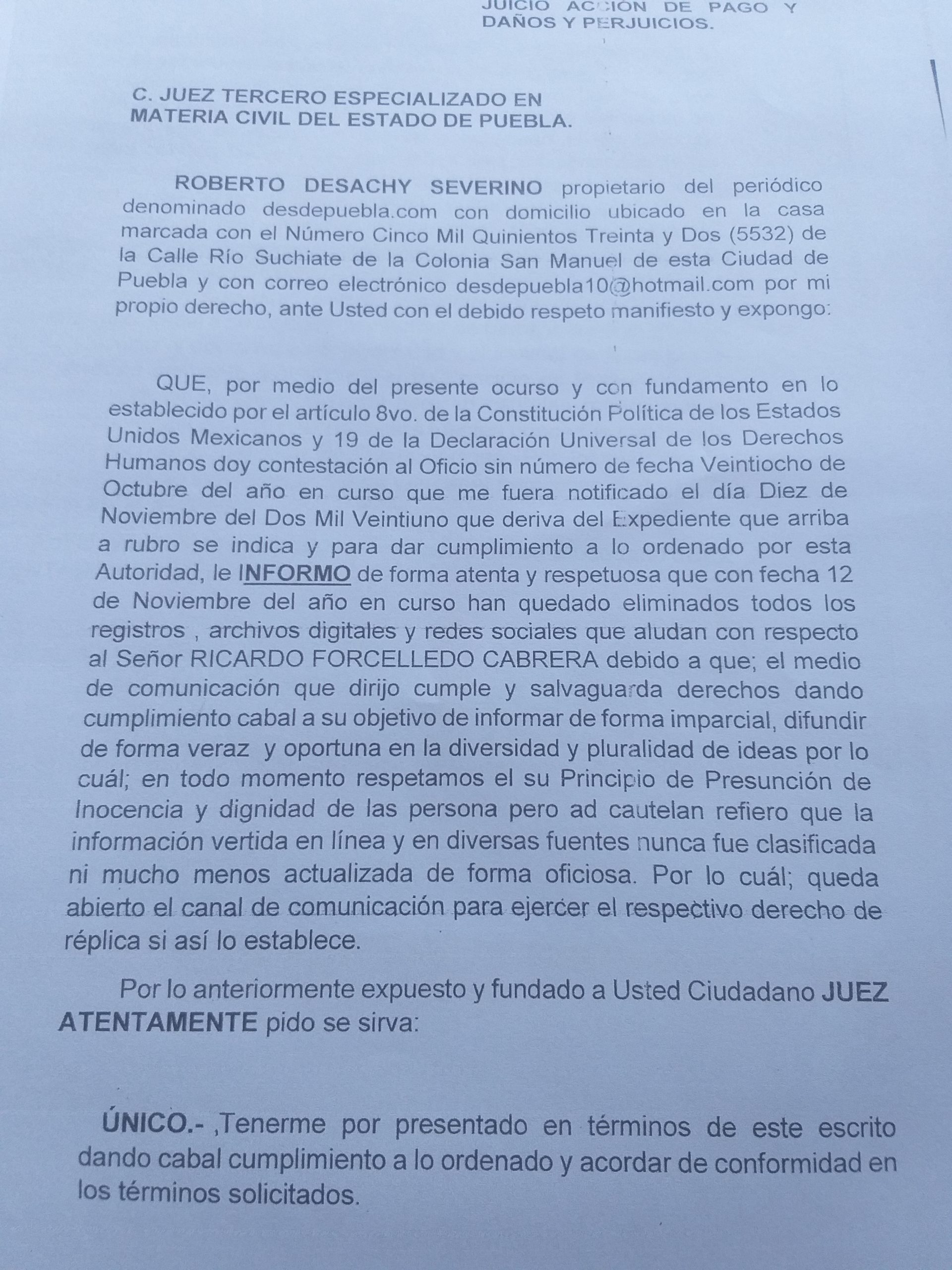 También se respondió el documento de la jueza tercero especializado en materia civil, según las recomendaciones de la abogada de Desde Puebla, que –como ya se dijo- no es sino uno más de los espacios informativos a los que diversos sujetos acusados de delitos serios, como acoso o maltrato a mujeres, parece que intentan amedrentar con argucias legalistas para que no se hable de sus presuntos excesos.