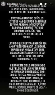 Beli inició su mensaje agradeciendo a todos sus fans por el apoyo que ha recibido en estos momentos difíciles y aseguró que está situación le ha dejado un gran dolor: ”Estos días han sido difíciles, ustedes más que nadie saben que soy una persona introvertida y es porque trata de cuidar mi corazón, pero inevitablemente me duele y mucho”, expresó.