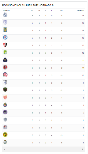 Así marcha la tabla general de la Liga MX Clausura 2022, luego de haberse disputado los primeros encuentros de la fecha 8