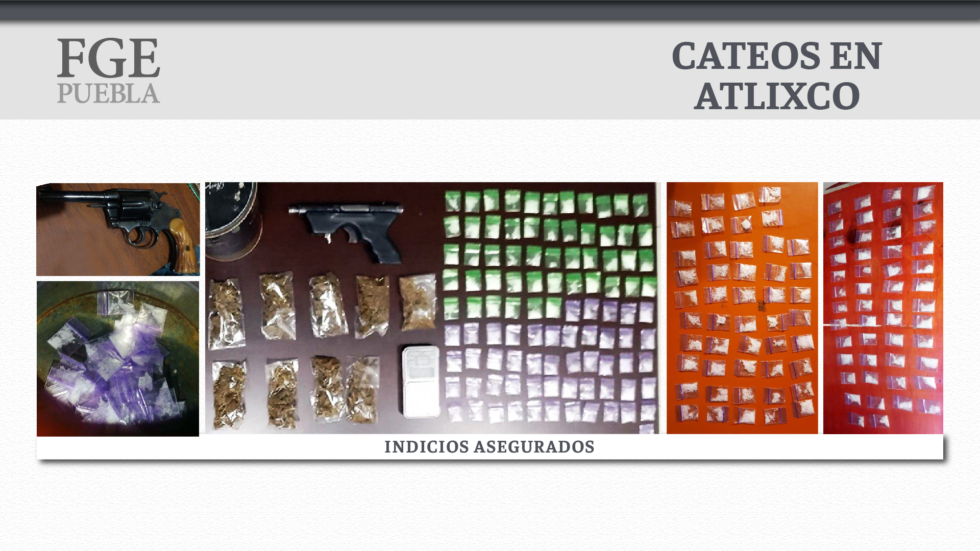 También en seguimiento, la Fiscalía General del Estado de Puebla solicitó, obtuvo y cumplió órdenes de cateo. En siete inmuebles del municipio de Atlixco donde aseguró: diversas cantidades de cristal y marihuana, dos armas de fuego, 11 motocicletas y básculas grameras.