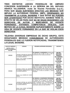 Tres jueces federales otorgaron suspensiones a María del Refugio Abarca Villaseñor, viuda del cantante Vicente Fernández, las cuales ordenan que continúen teniendo efectos las medidas provisionales que impuso el Instituto Mexicano de la Propiedad Industrial (IMPI) a Grupo Televisa para que no transmita la bioserie El último Rey, el hijo del pueblo.